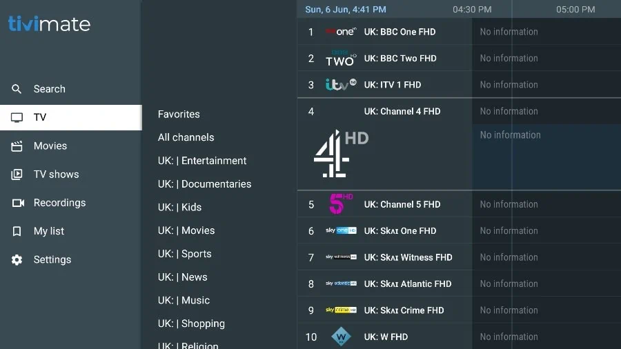 A minute or two later, you will see the IPTV service’s content appearing in the TiviMate app. Most IPTV services come with a dedicated EPG (electronic program guide), as shown below.